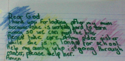 Thank you for looking after my mum because she is working hard to earn money so we can pay the bills.